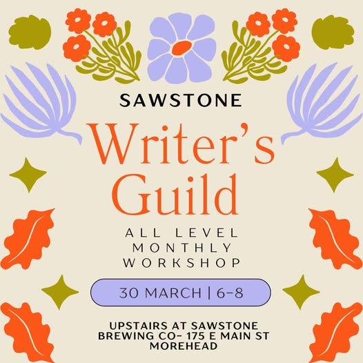 But sadly our second Teen Writers Day Out did not attract enough interest and there was even less interest in our Spring Break Writing Camps (with the most excellent theme of Manifestos, Monsters, and Other Strange Things) garnered even less. So I do not know what writing in community with young people will look like for me in the future. However, my practice retirement has helped me gain some perspective and for now I am willing to wait and see. One good came out of the cancellation of the Spring Break Writing Camps. I was able to accept an invitation to the Sawstone Writer’s Guild